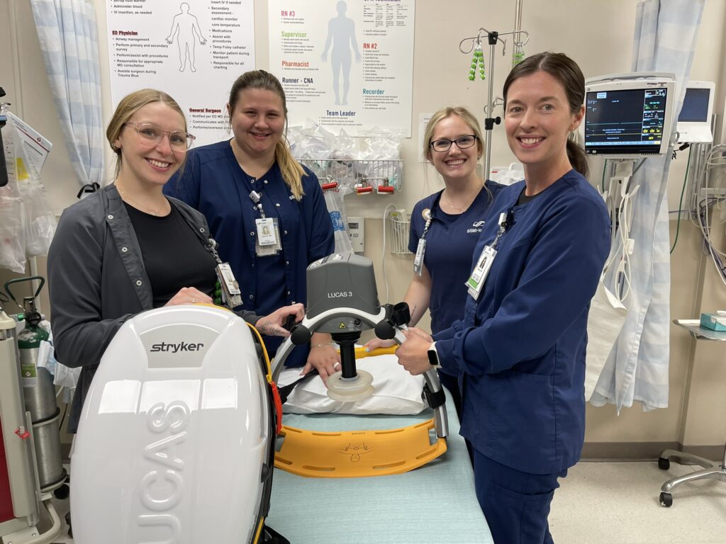Photo caption: SSM Health Waupun Memorial Hospital’s Emergency Room now has a new LUCAS 3 chest compression system thanks to the Dodge County Public Health team. Among staff who is utilizing the new equipment are (left to right) Alexx Mitchell, clinical partner, Lauren Winchell, RN, Olivia Ambrose, RN, and Devan Nehls, RN.