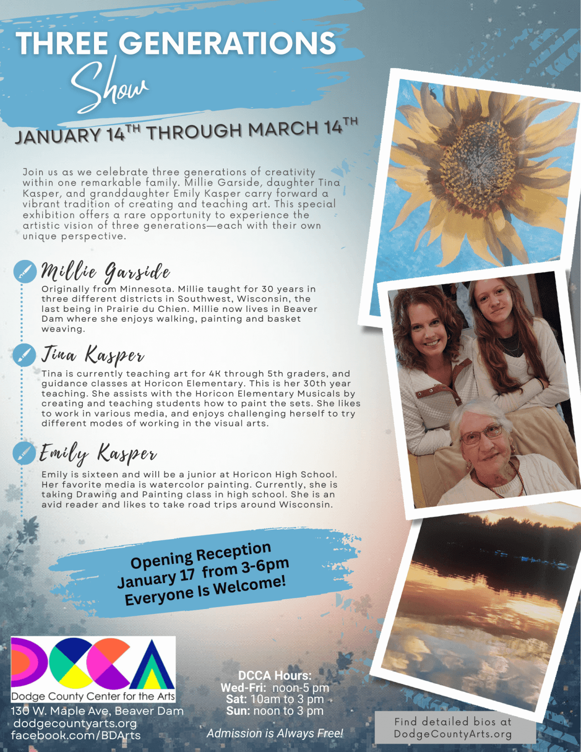 Join us as we celebrate three generations of creativity within one remarkable family. Millie Garside, daughter Tina Kasper, and granddaughter Emily Kasper carry forward a vibrant tradition of creating and teaching art. This special exhibition offers a rare opportunity to experience the artistic vision of three generations—each with their own unique perspective.