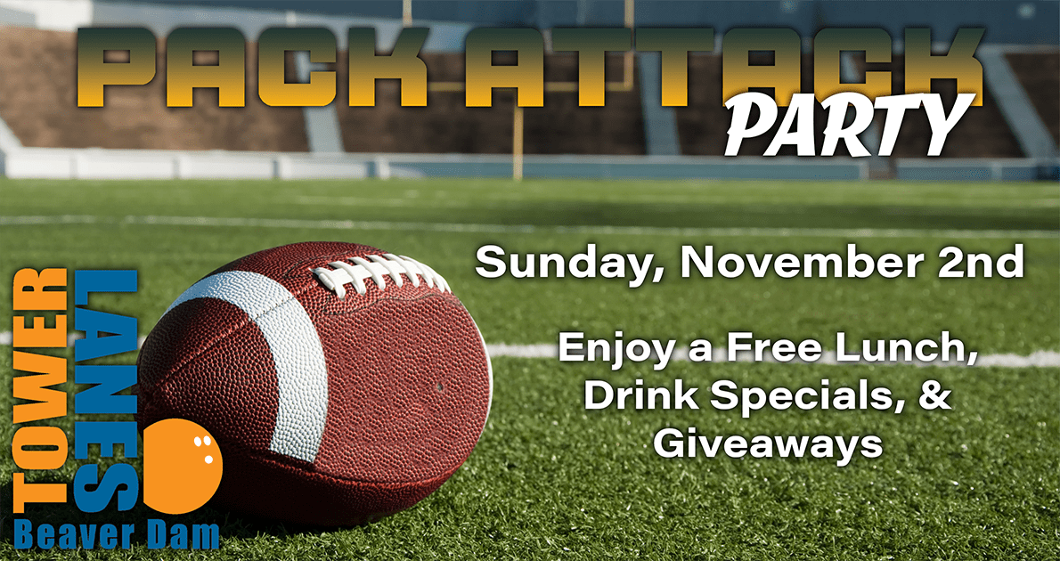 Join us Sunday, November 2nd at Tower Lanes in Beaver Dam for our next Pack Attack Party! Enjoy a free light lunch from Pizza Ranch and The Market at Beaver Dam! Plus drink specials, giveaways, meat raffle to benefit the Good Karma Brands John Moser Children’s Radiothon, and watch on Tower Lanes many TV’s as Green Bay takes on Carolina.